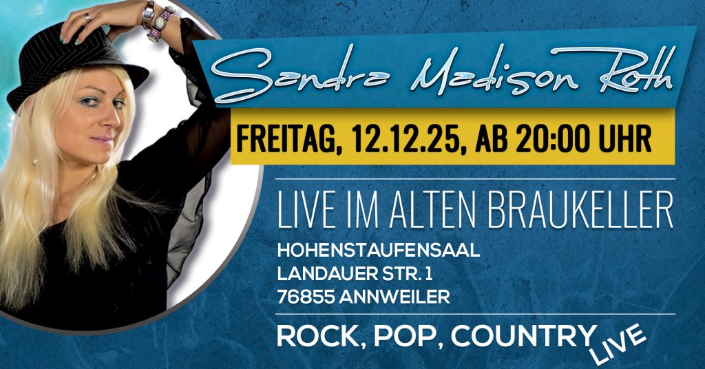 Am 12.12. dann mit Sandra Madison Roth mit Country, Rock und Pop live in der einzigartigen Atmosphäre des alten Braukellers des Hohenstaufensaals.