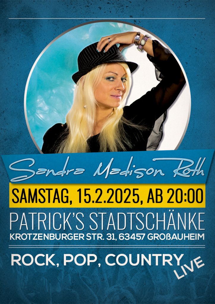 Es ist wieder soweit, die Stimmgewaltige Sandra Madison Roth zu Gast in der Stadtschänke! Freut euch auf Rock, Pop & Country.